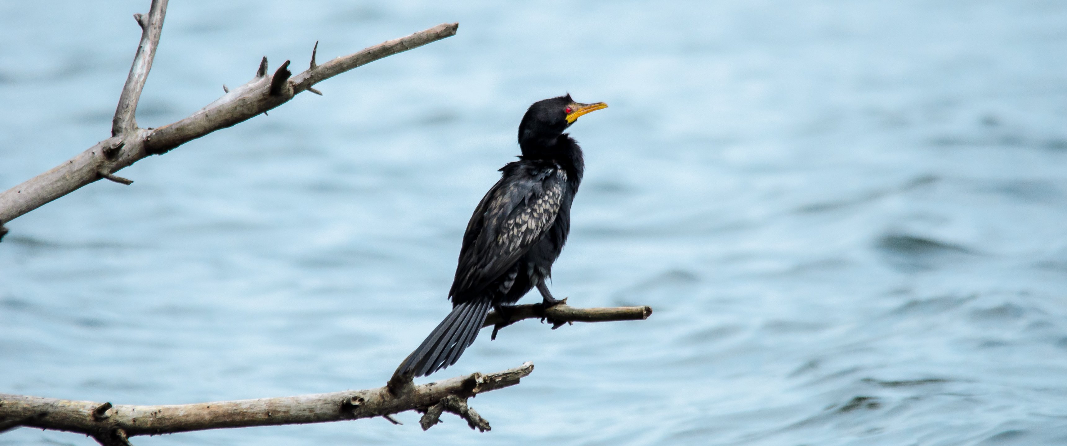 Wallpaper: lake, black bird, red eyes - 3440x1440
