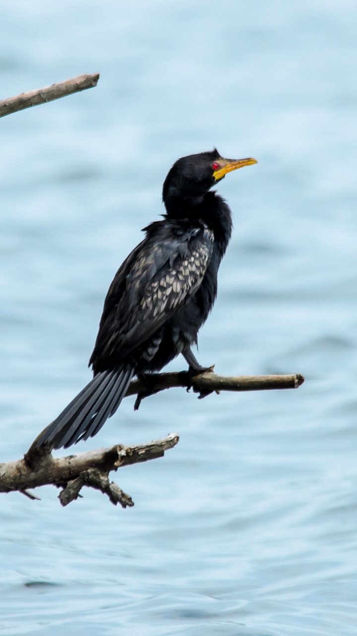 Wallpaper: lake, black bird, red eyes - 720x1280