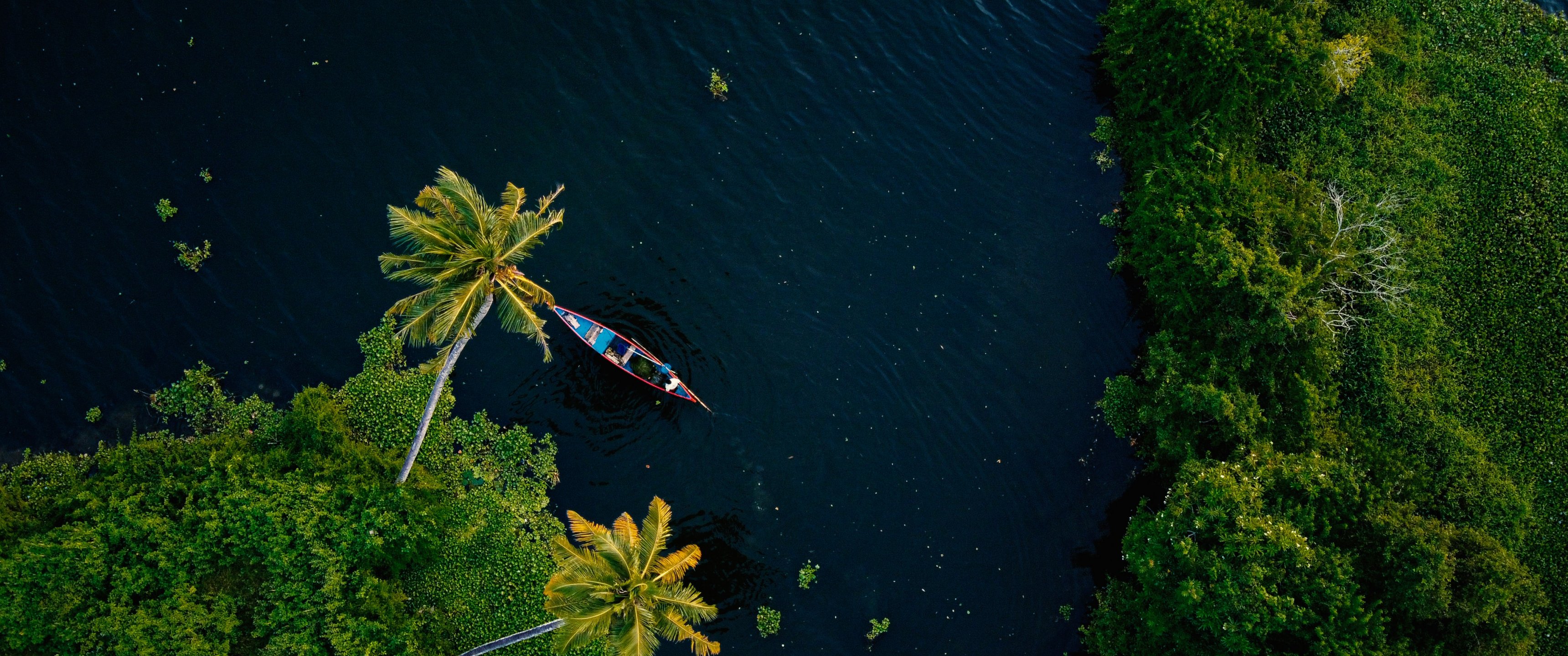 Wallpaper: Alappuža, Kerala, India, palm trees, water, transport - 3440x1440