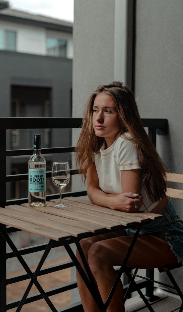Wallpaper: girl, balcony, bottle of wine - 600x1024