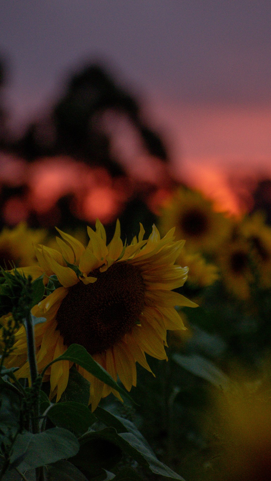 Wallpaper: field of sunflowers, sunset, dawn - 1080x1920