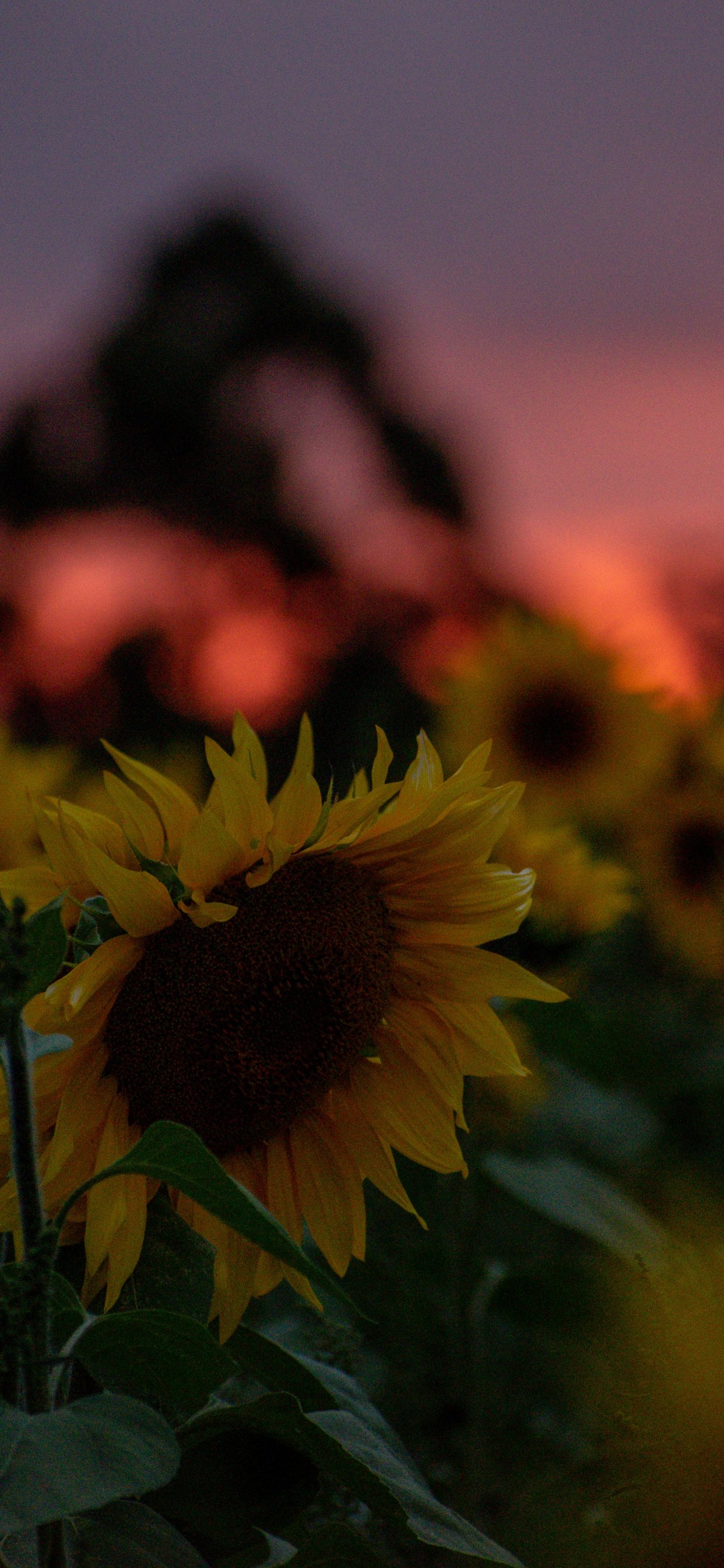 Wallpaper: field of sunflowers, sunset, dawn - 1242x2688