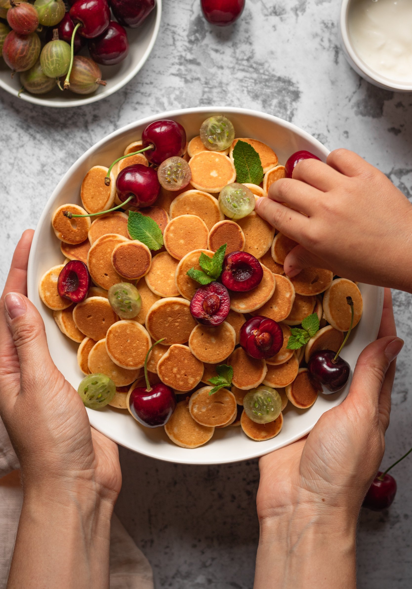 pancakes, honey, berries