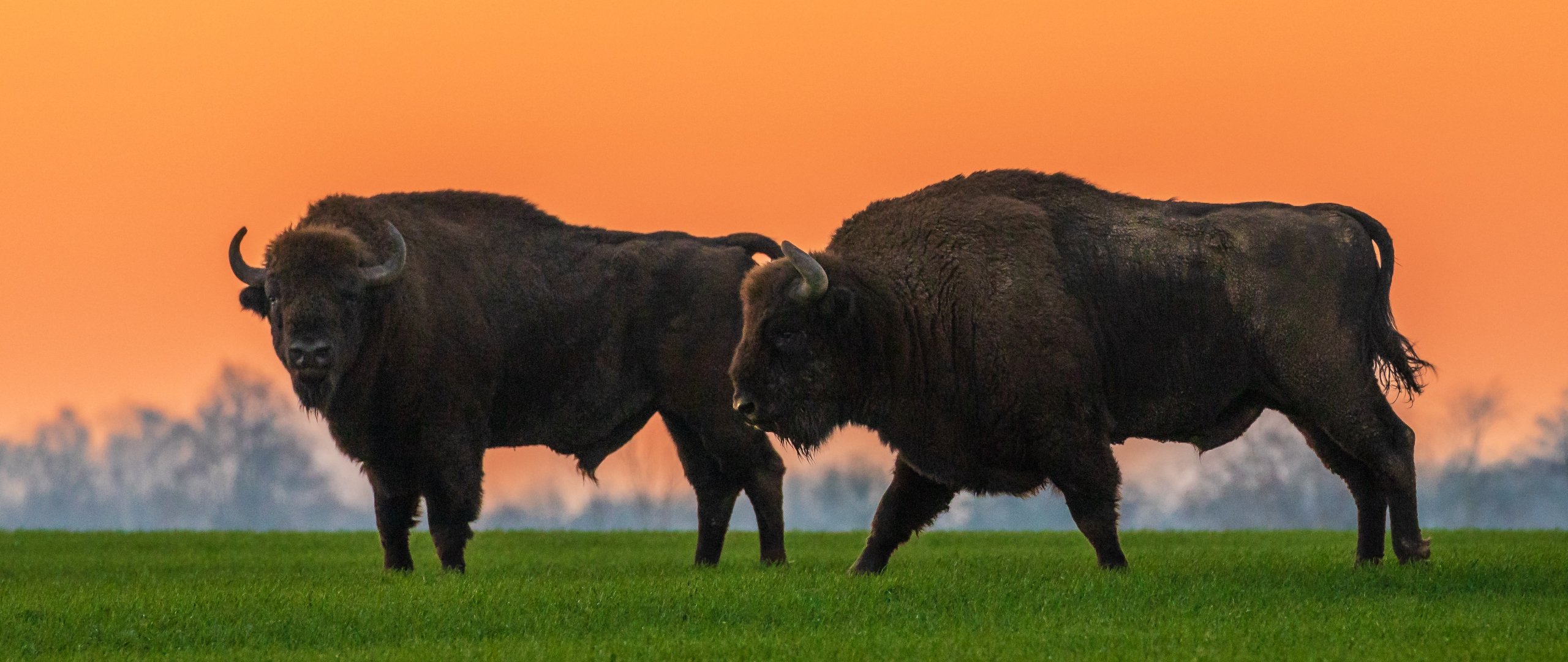 Wallpaper: Krynki, Poland, two bison - 2560x1080