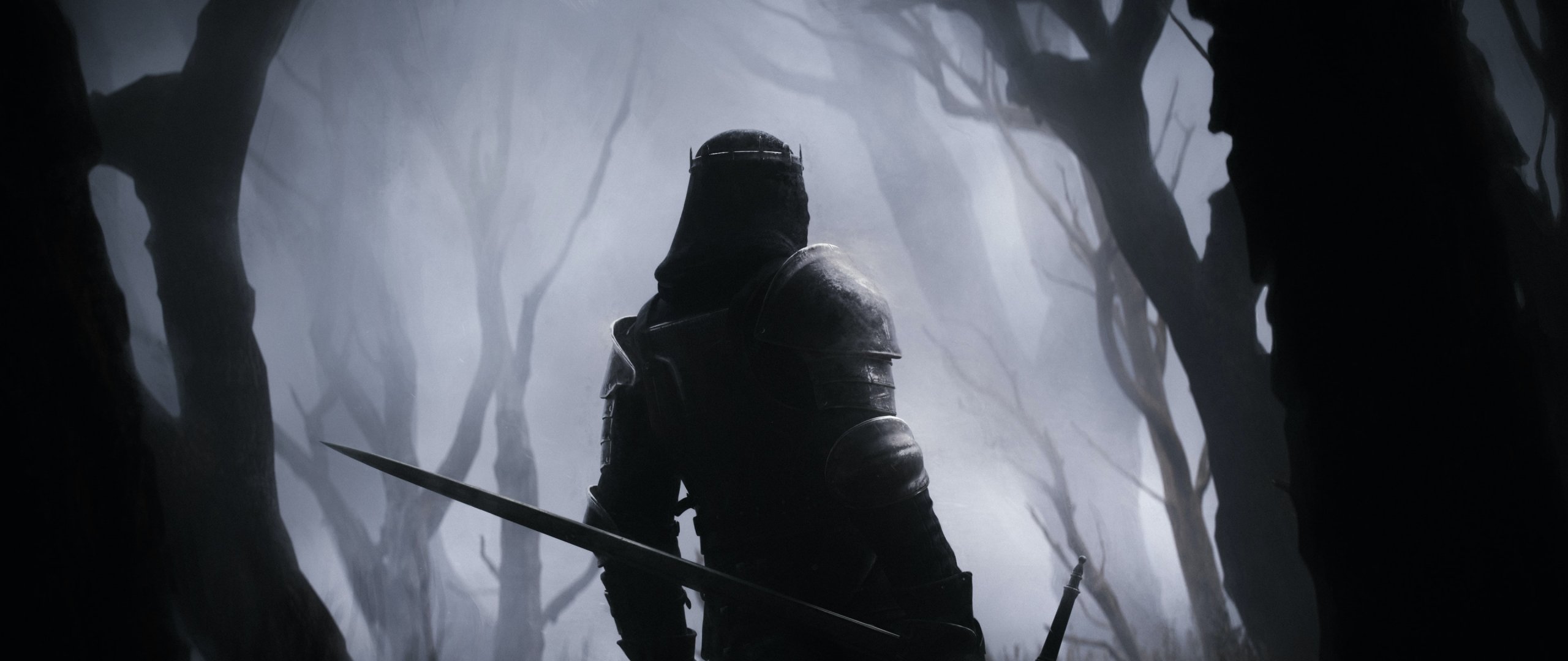 Wallpaper: warrior, forest, sword - 2560x1080