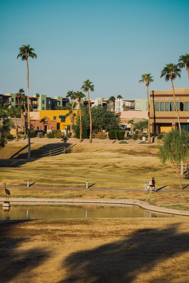Wallpaper: palm trees, lake, city - 640x960