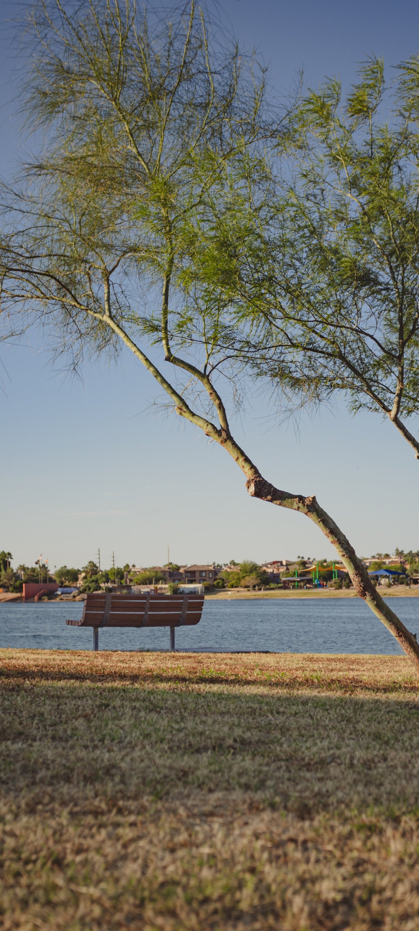 Wallpaper: lake, landscape, city - 1440x3200