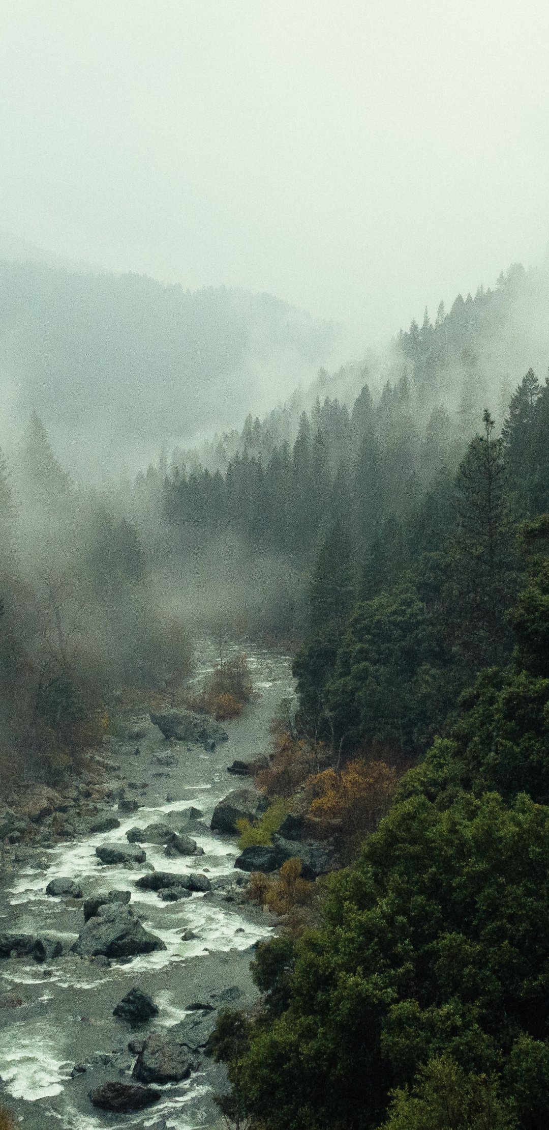Wallpaper: river, forest, fog - 1080x2220