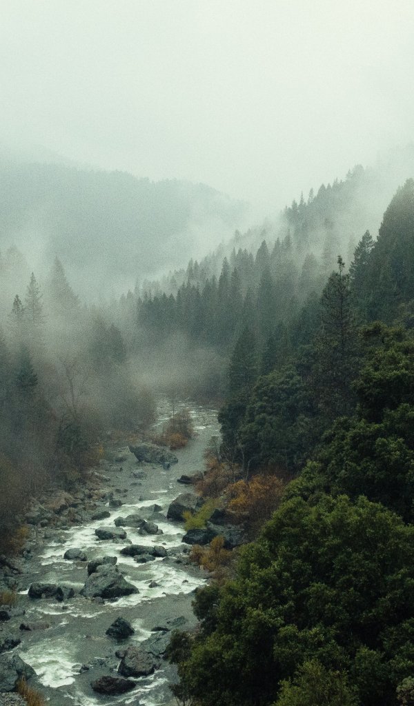 Wallpaper: river, forest, fog - 600x1024