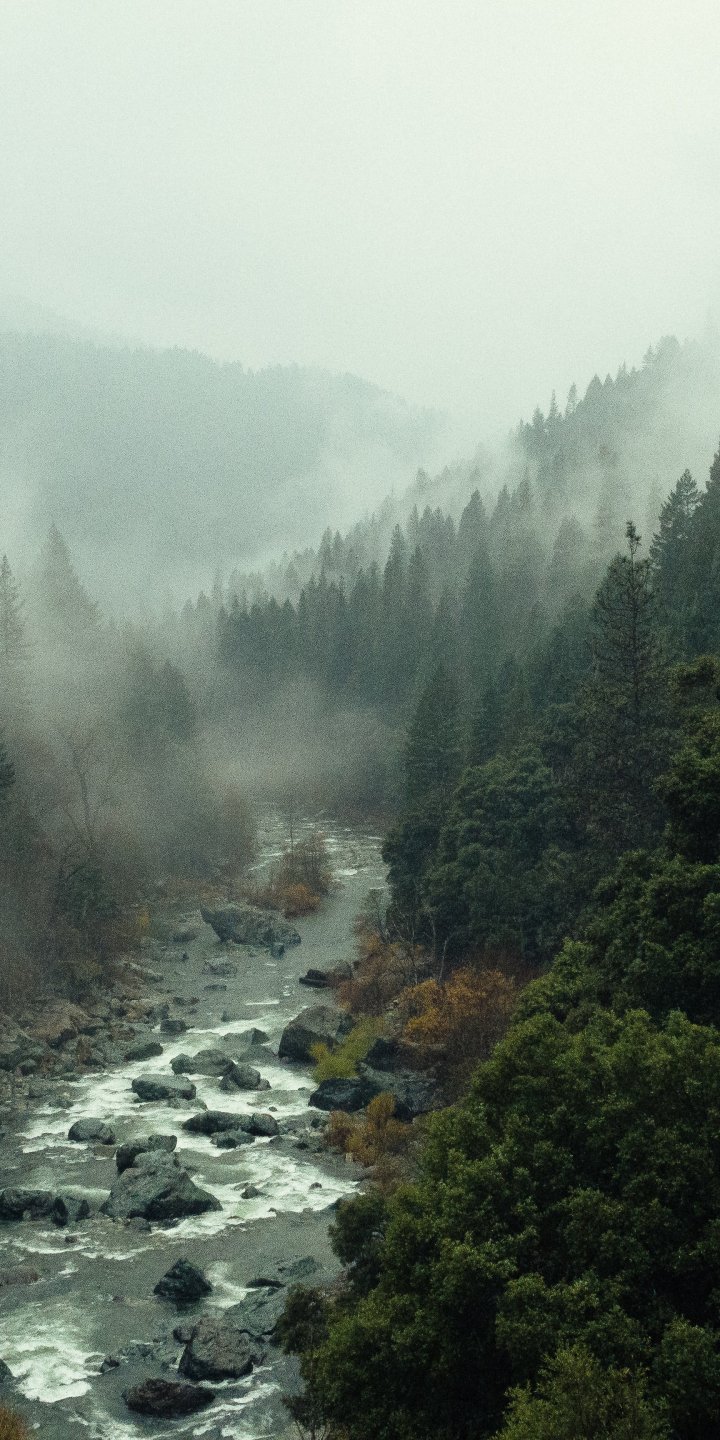 Wallpaper: river, forest, fog - 720x1440