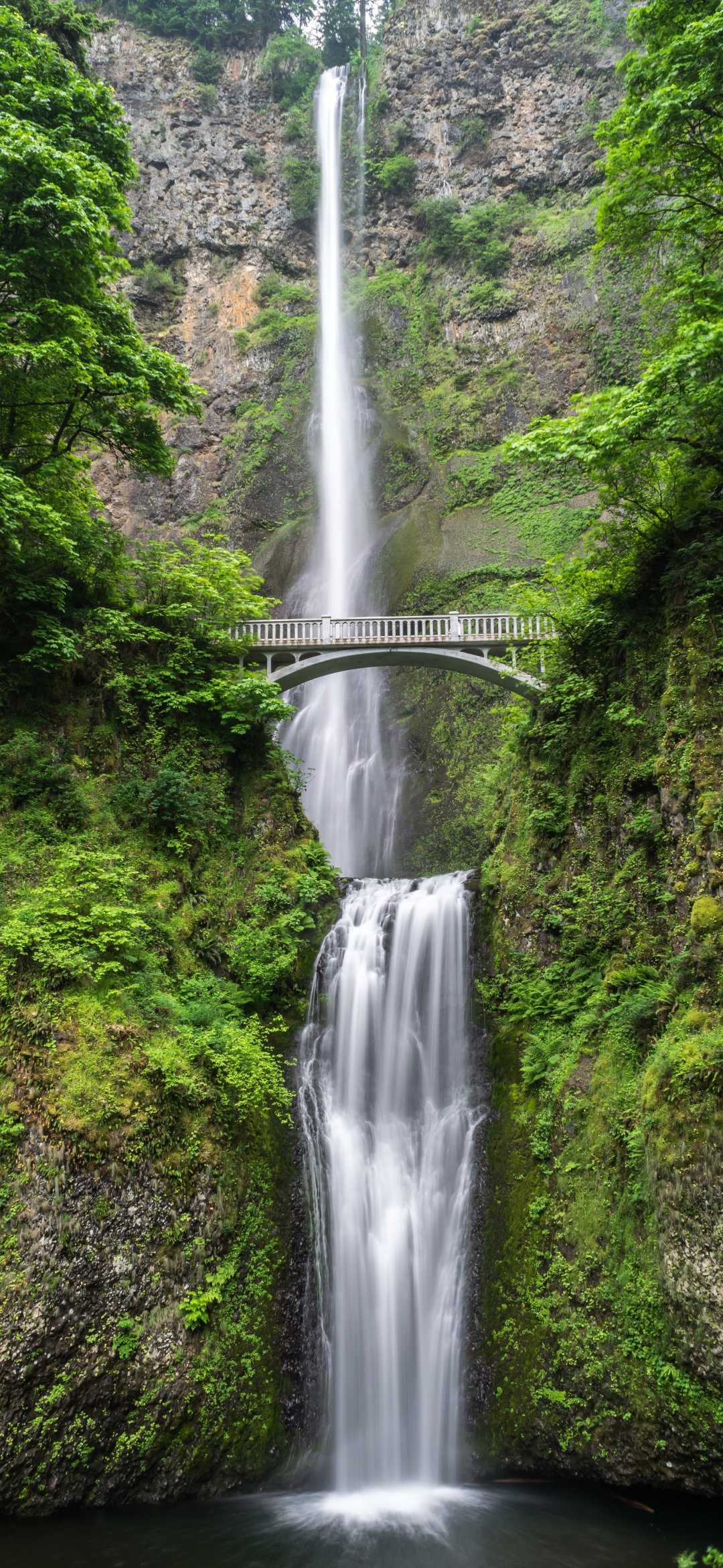 Wallpaper: waterfall, bridge, mountains - 1080x2340