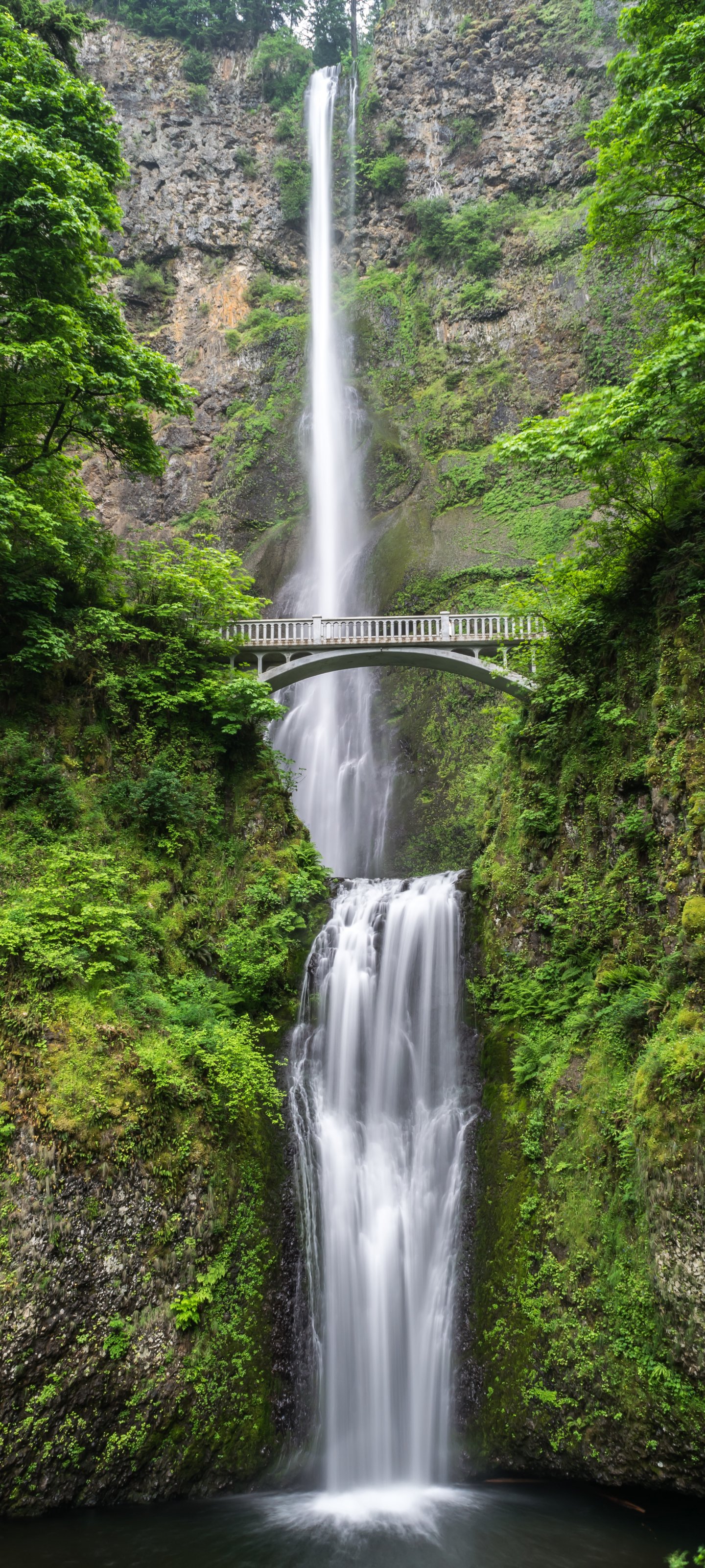 Wallpaper: waterfall, bridge, mountains - 1440x3200