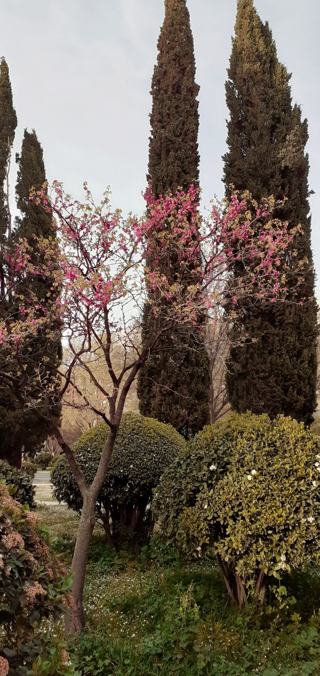 Wallpaper: trees, flower bed, lawn - 1080x2280