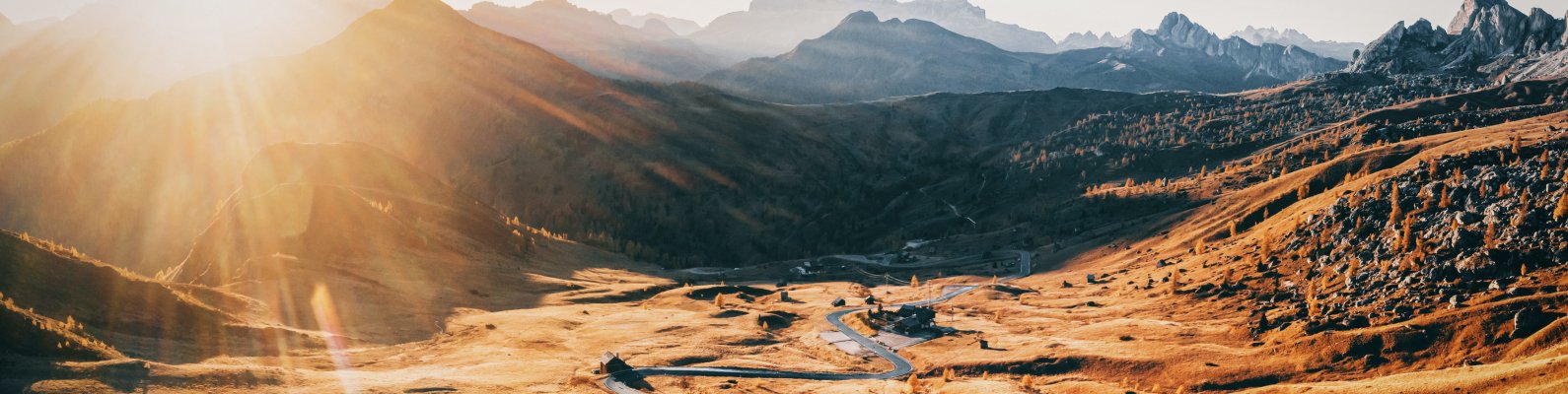 Wallpaper: road between mountains, mountain peaks - 1590x400