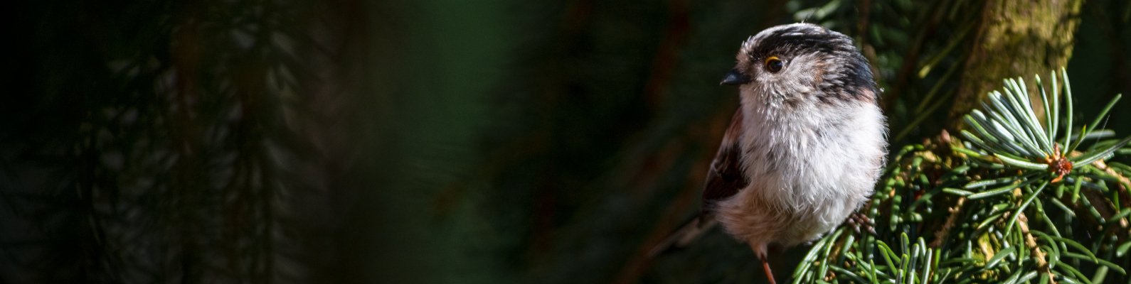 Wallpaper: little bird, in spruce branches - 1590x400