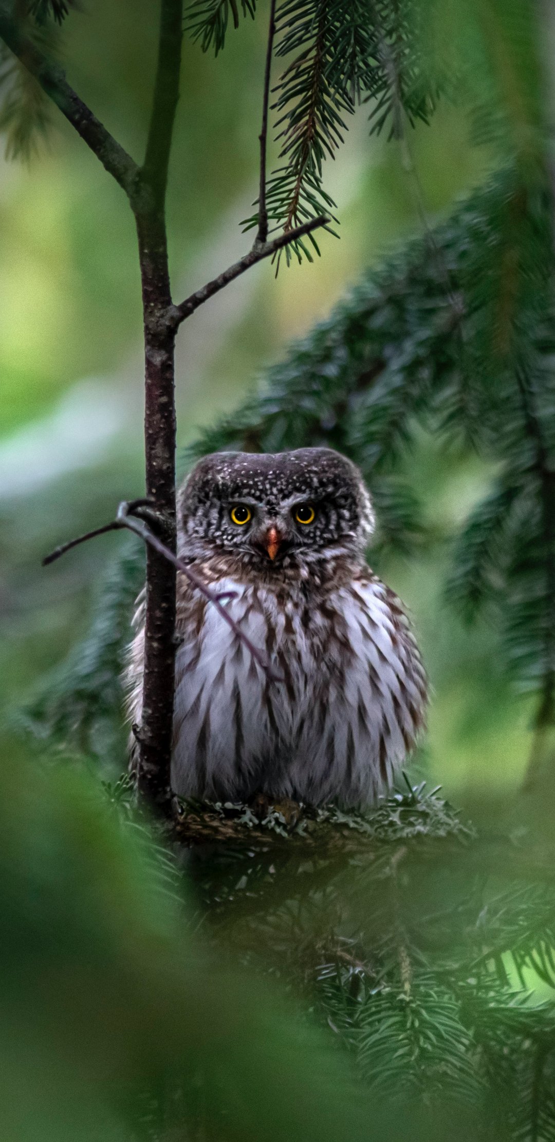 Wallpaper: owl, in spruce branches - 1080x2220