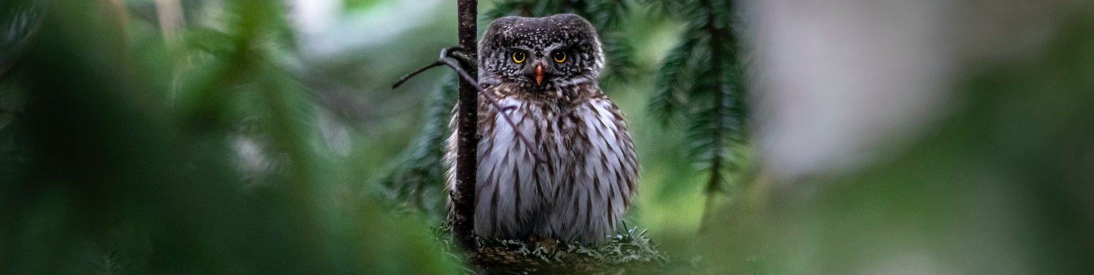 Wallpaper: owl, in spruce branches - 1590x400