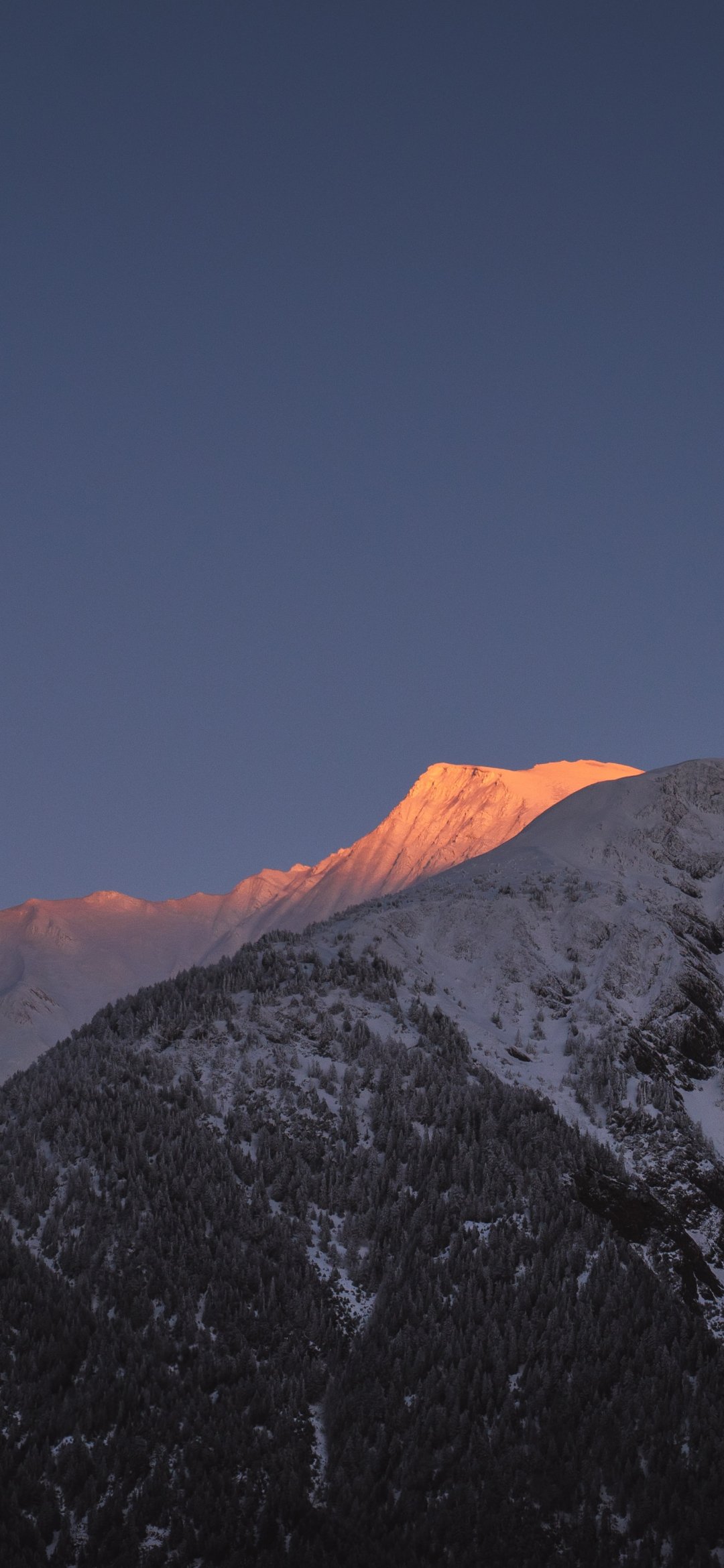 mountain, peak, forest, snow, trees, calm, pacification Wallpaper 1080x2340