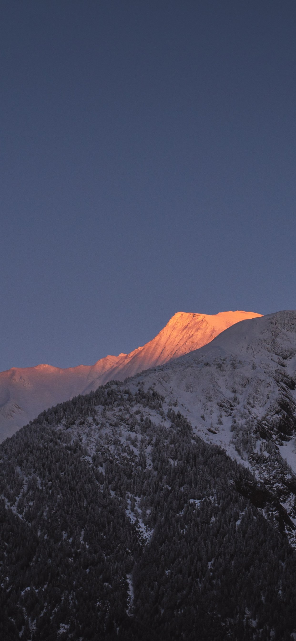 mountain, peak, forest, snow, trees, calm, pacification Wallpaper 1242x2688