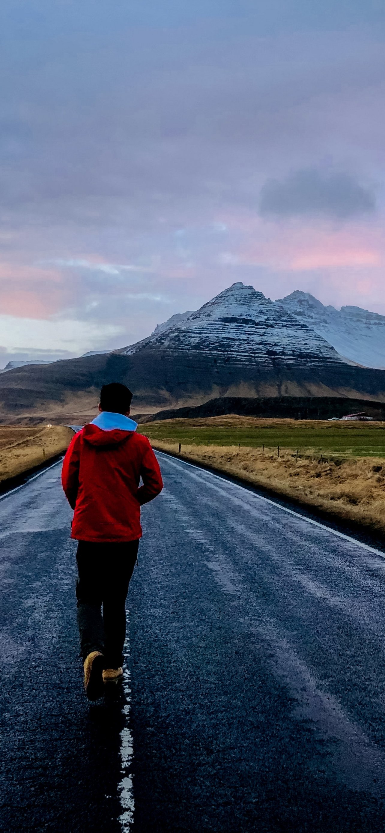 Wallpaper: mountains, walking down the road - 1284x2778