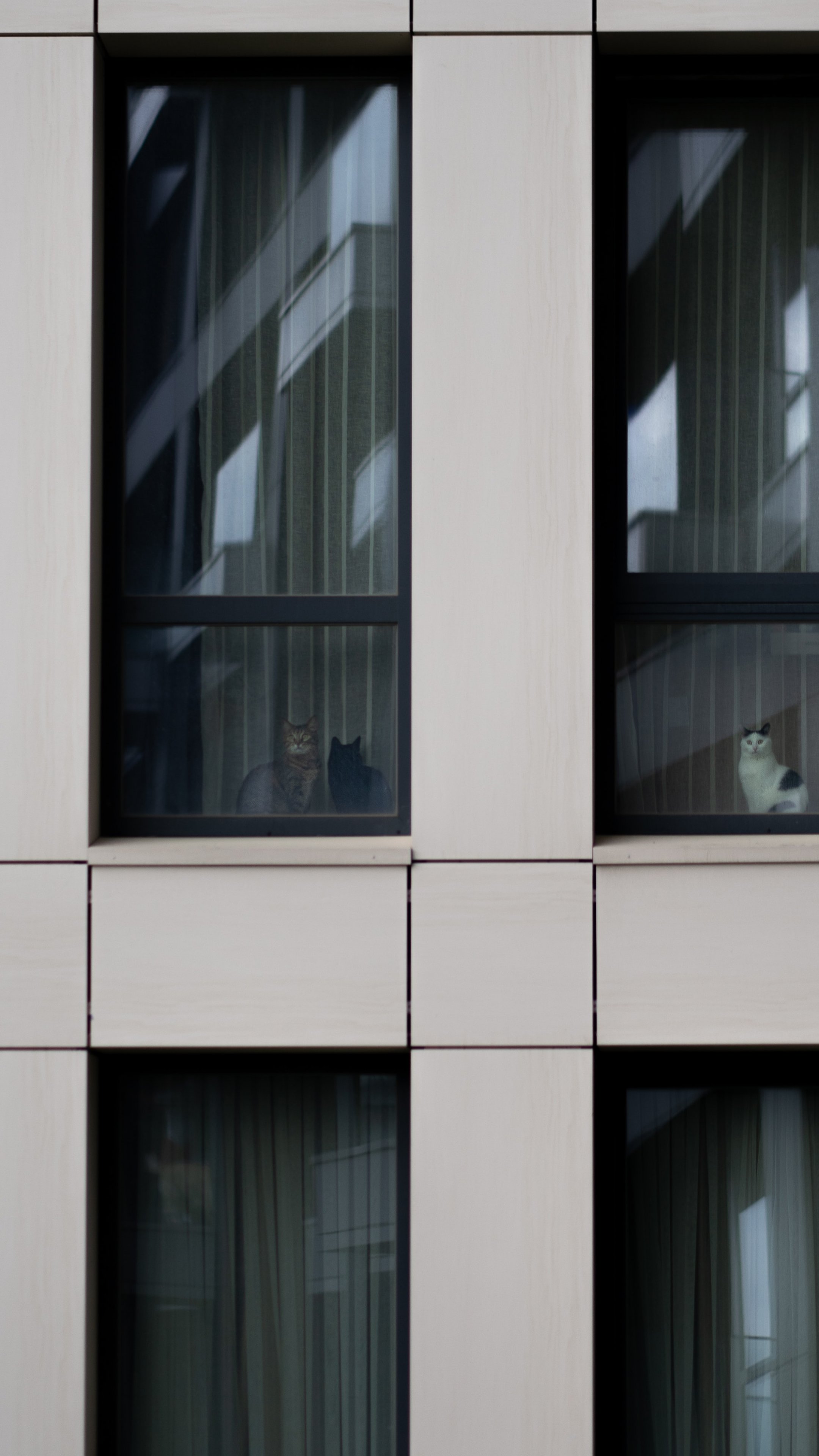 Wallpaper: gray house, cats in windows - 2160x3840