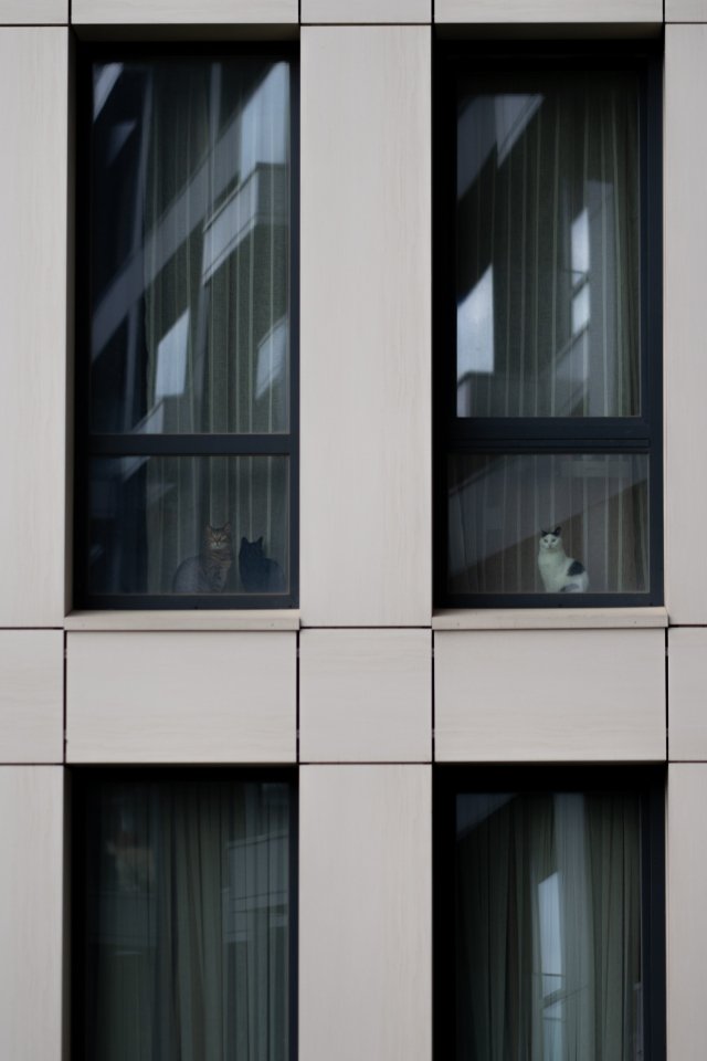 Wallpaper: gray house, cats in windows - 640x960