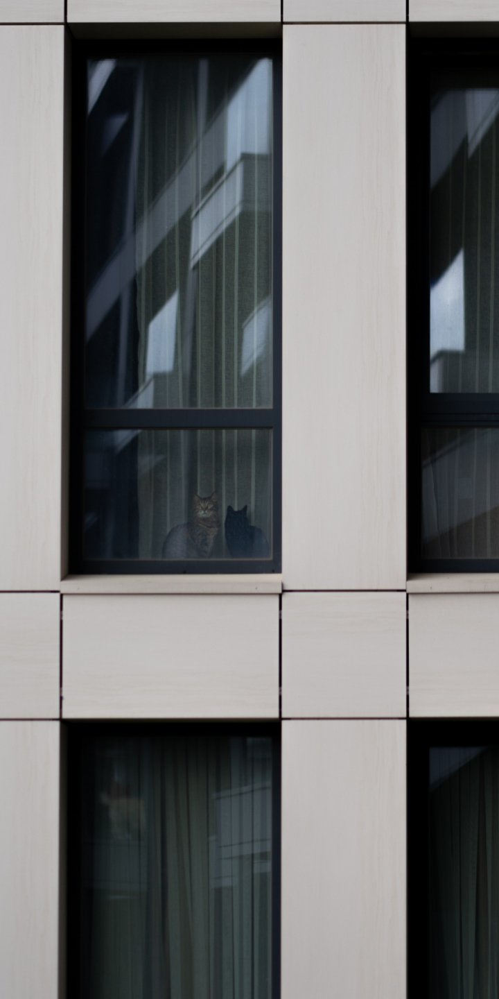 Wallpaper: gray house, cats in windows - 720x1440