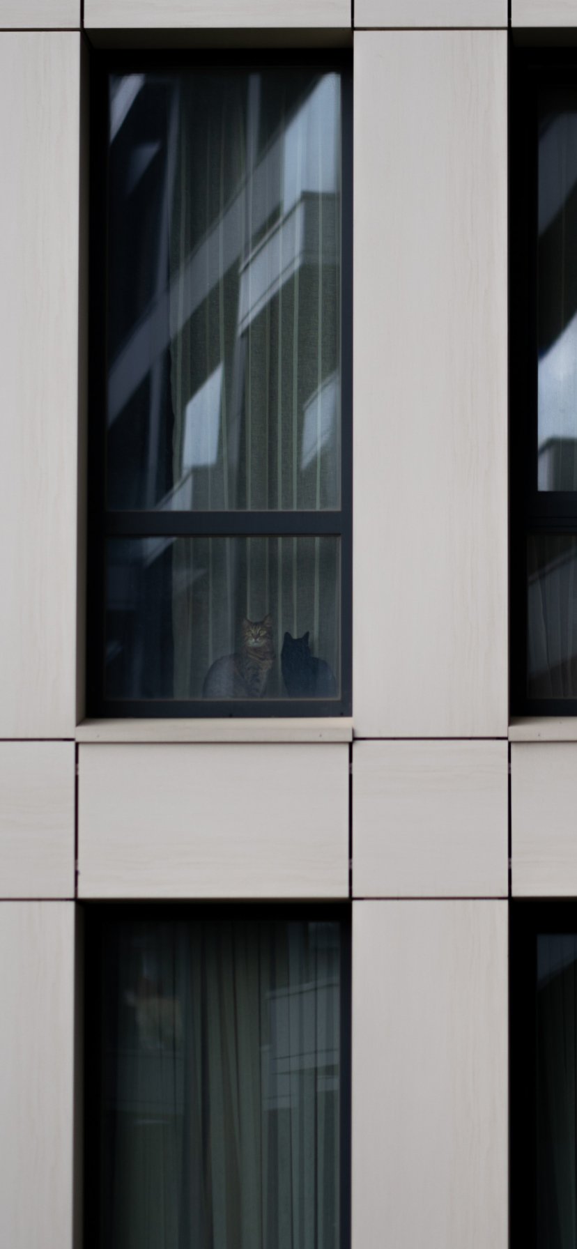 Wallpaper: gray house, cats in windows - 828x1792