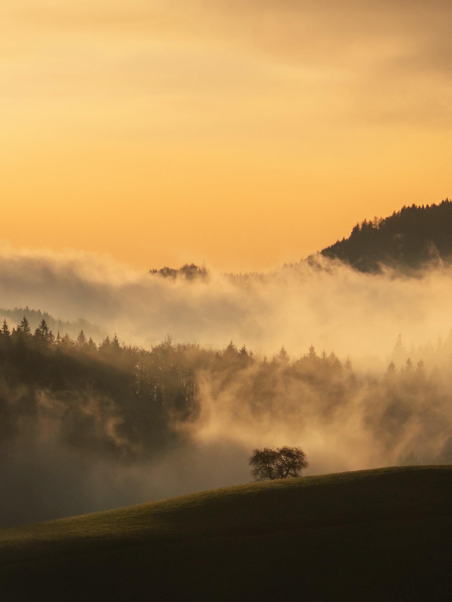Wallpaper: dawn, valley, mist - 1536x2048