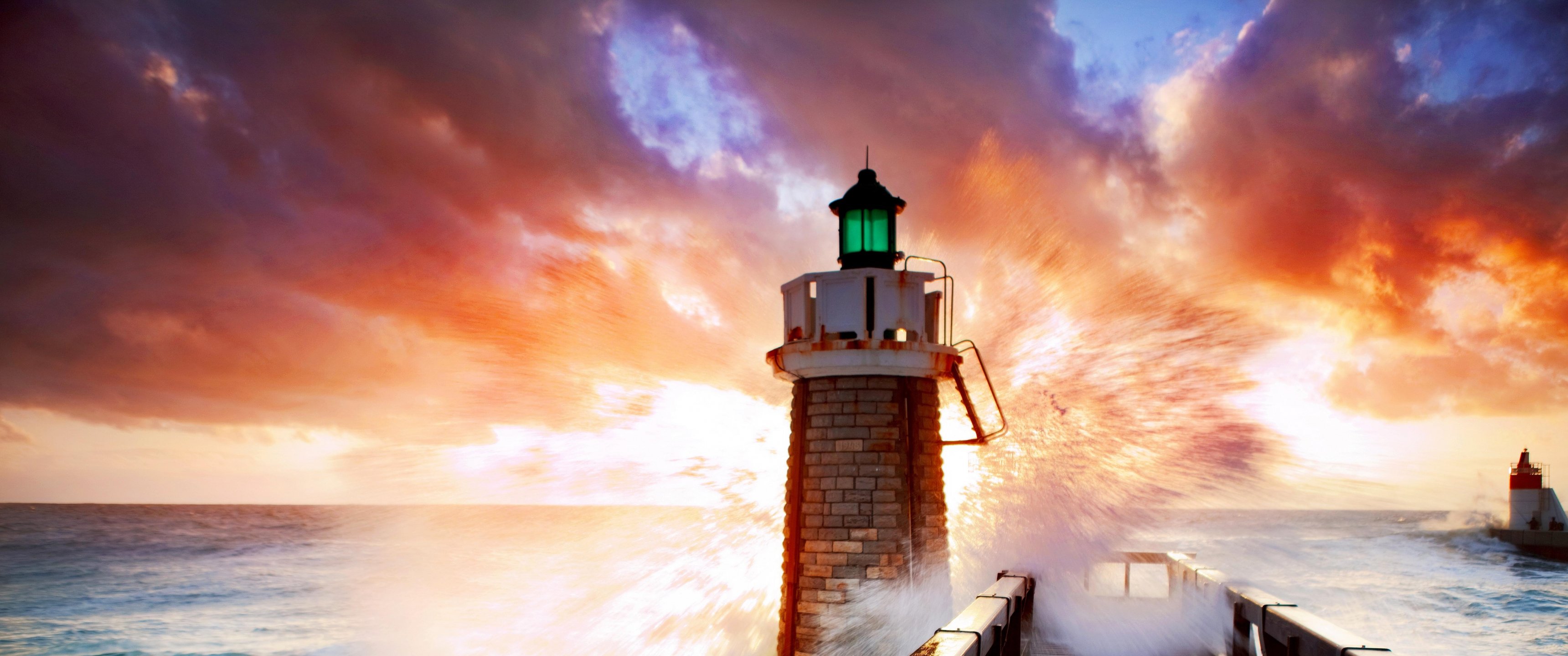 Wallpaper: lighthouse, ocean, waves - 3440x1440