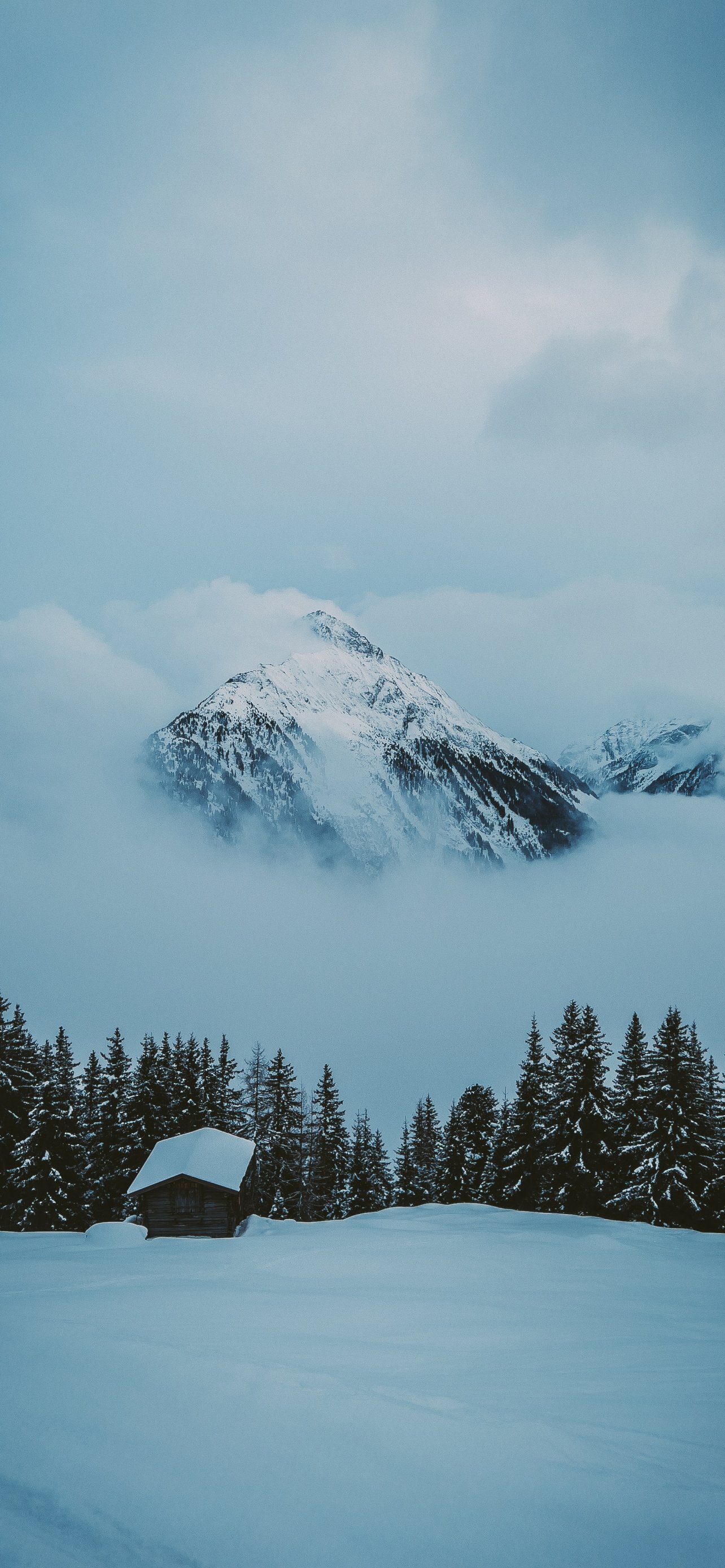 Wallpaper: snow mountain, house - 1284x2778
