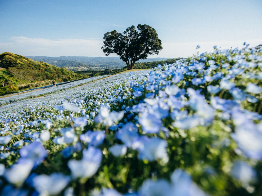 Wallpaper: flower field, tree - 1024x768