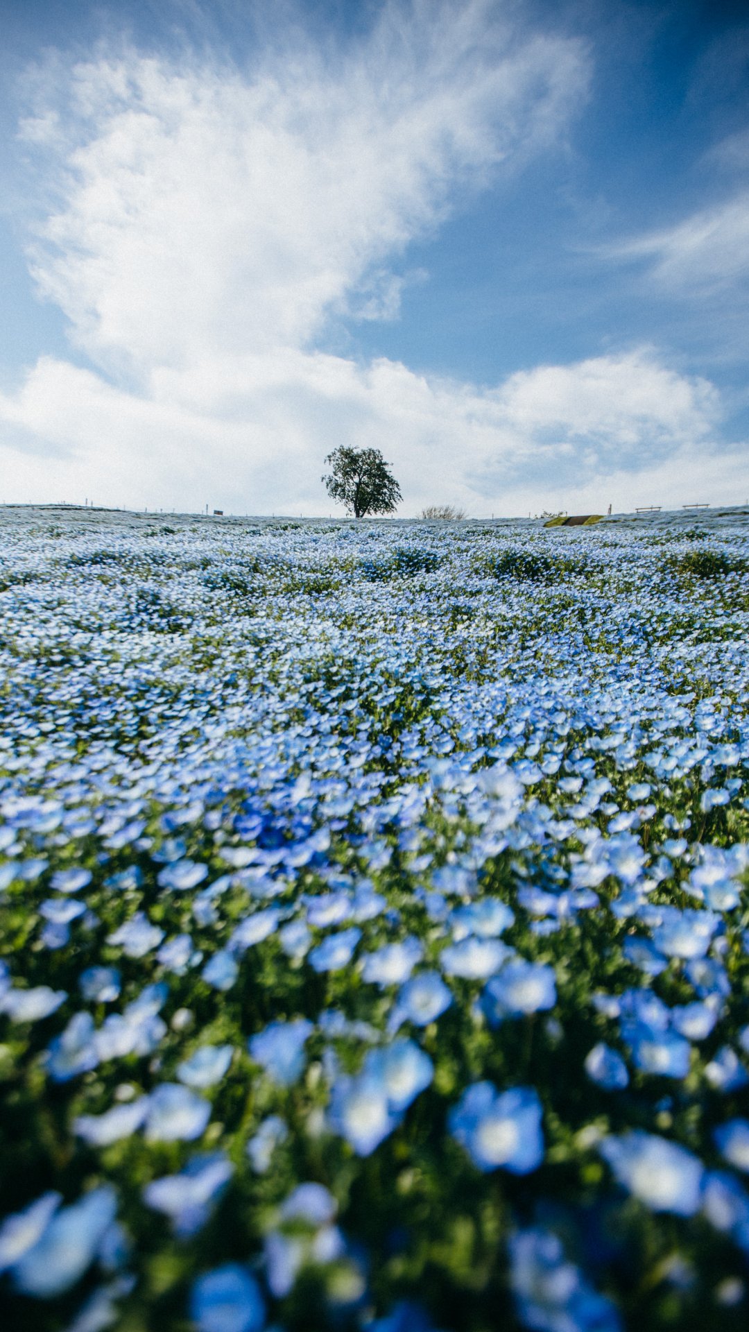 Wallpaper: flower field, tree, sky - 1080x1920