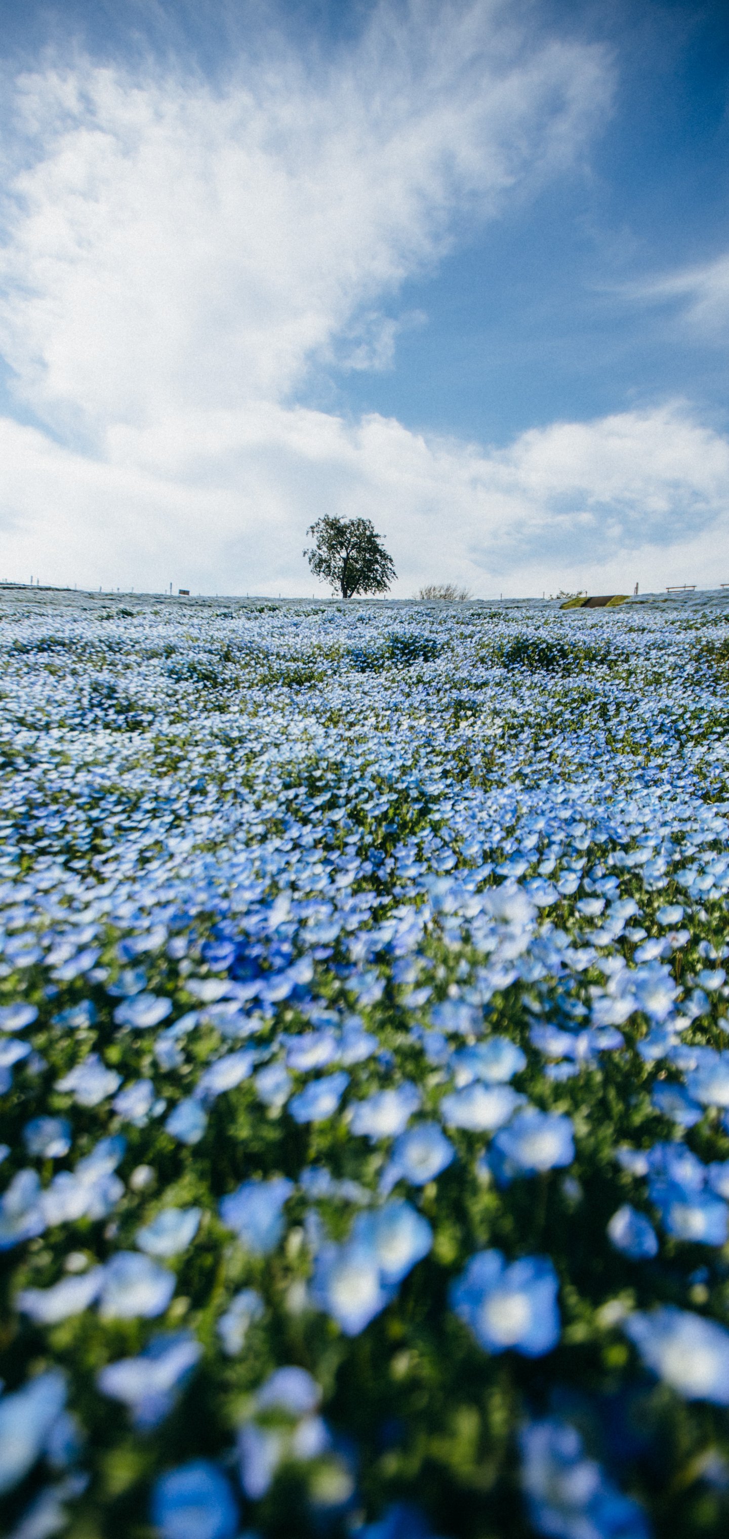 Wallpaper: flower field, tree, sky - 1440x3040