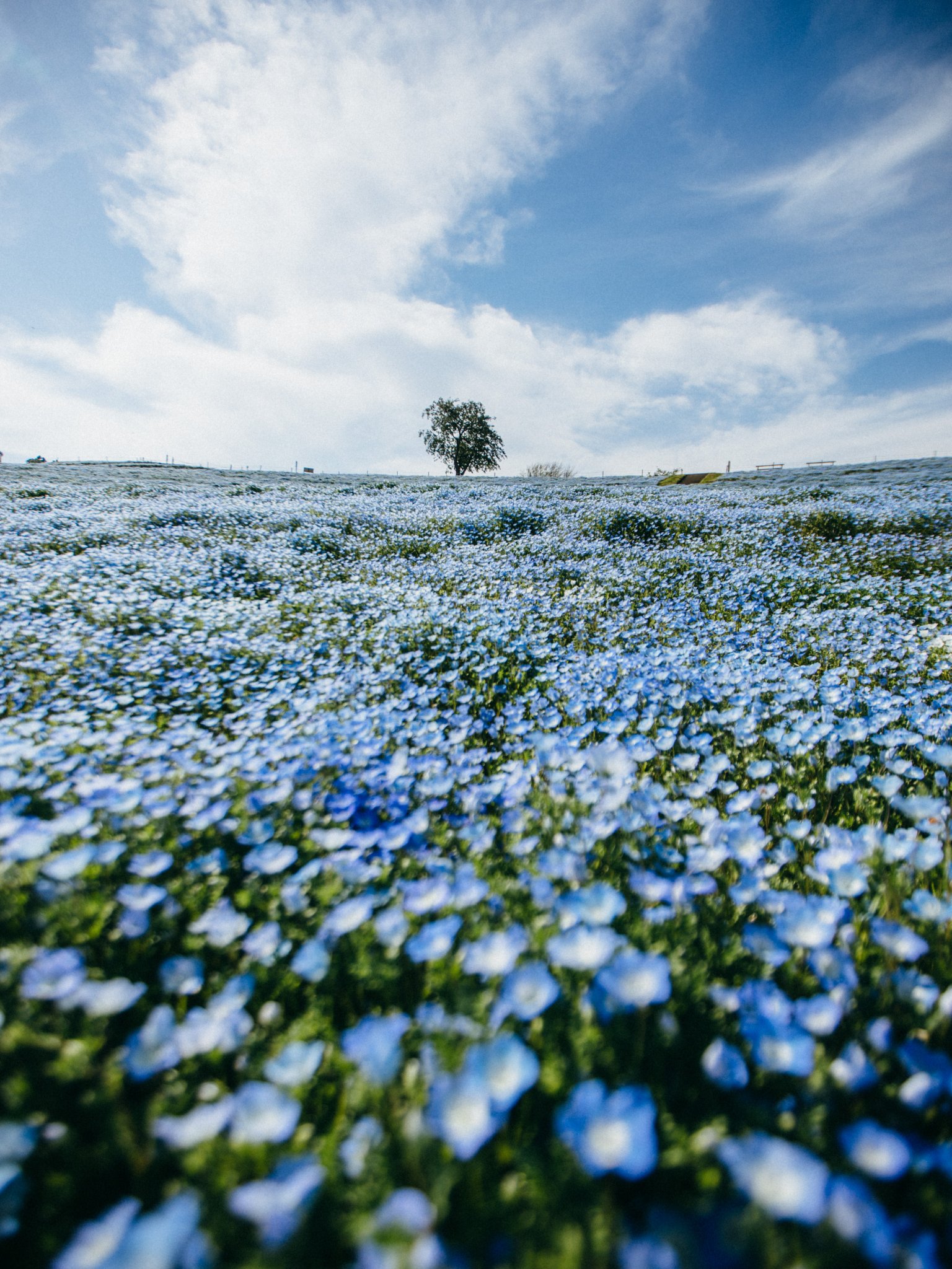 Wallpaper: flower field, tree, sky - 1536x2048