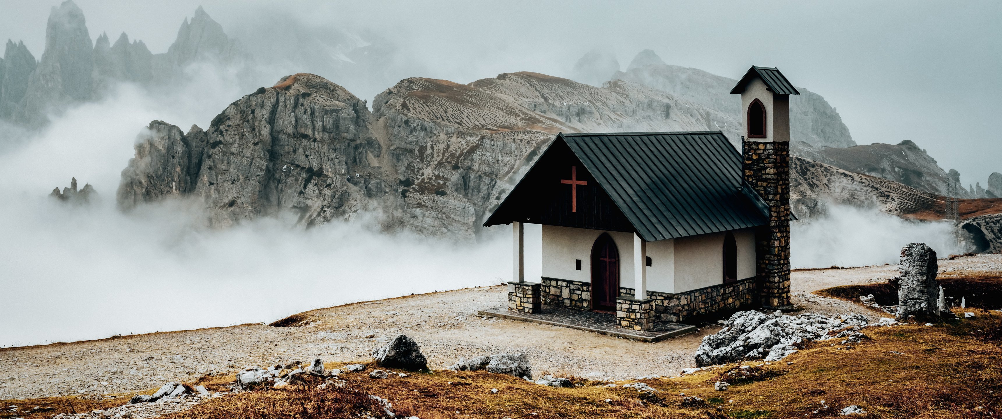 Wallpaper: church, in the mountains - 3440x1440