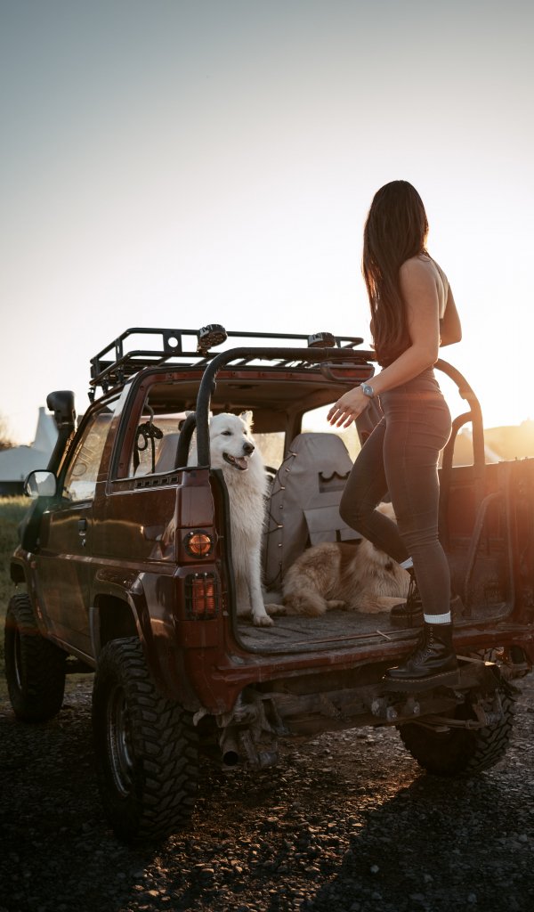 Wallpaper: machine with dogs, girl - 600x1024