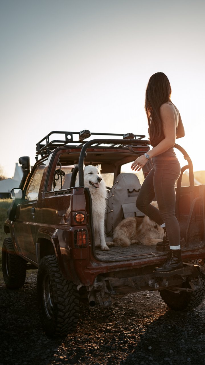 Wallpaper: machine with dogs, girl - 720x1280