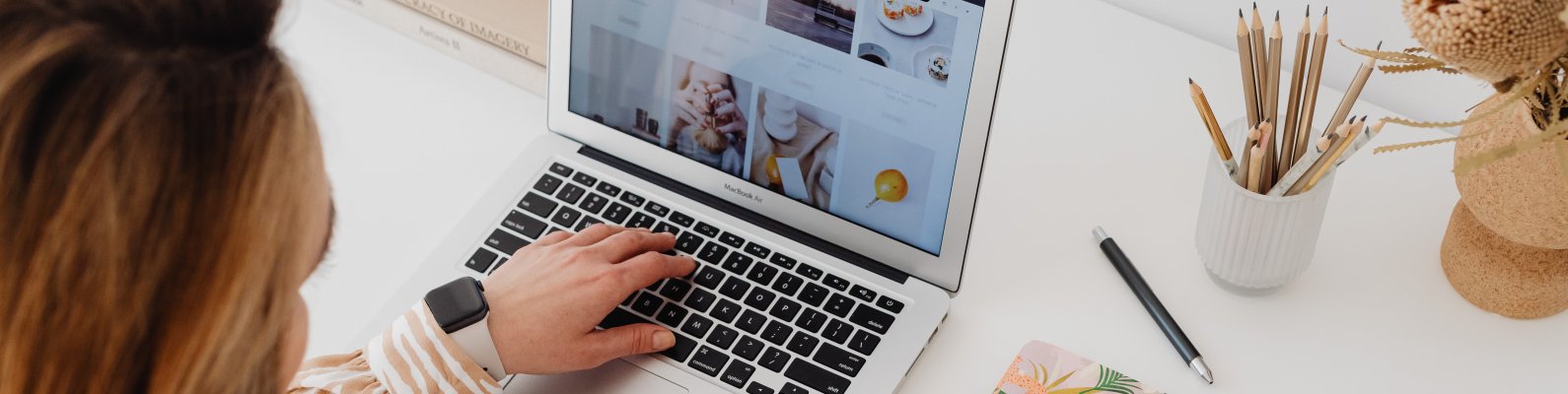 Wallpaper: woman at desk - 1590x400