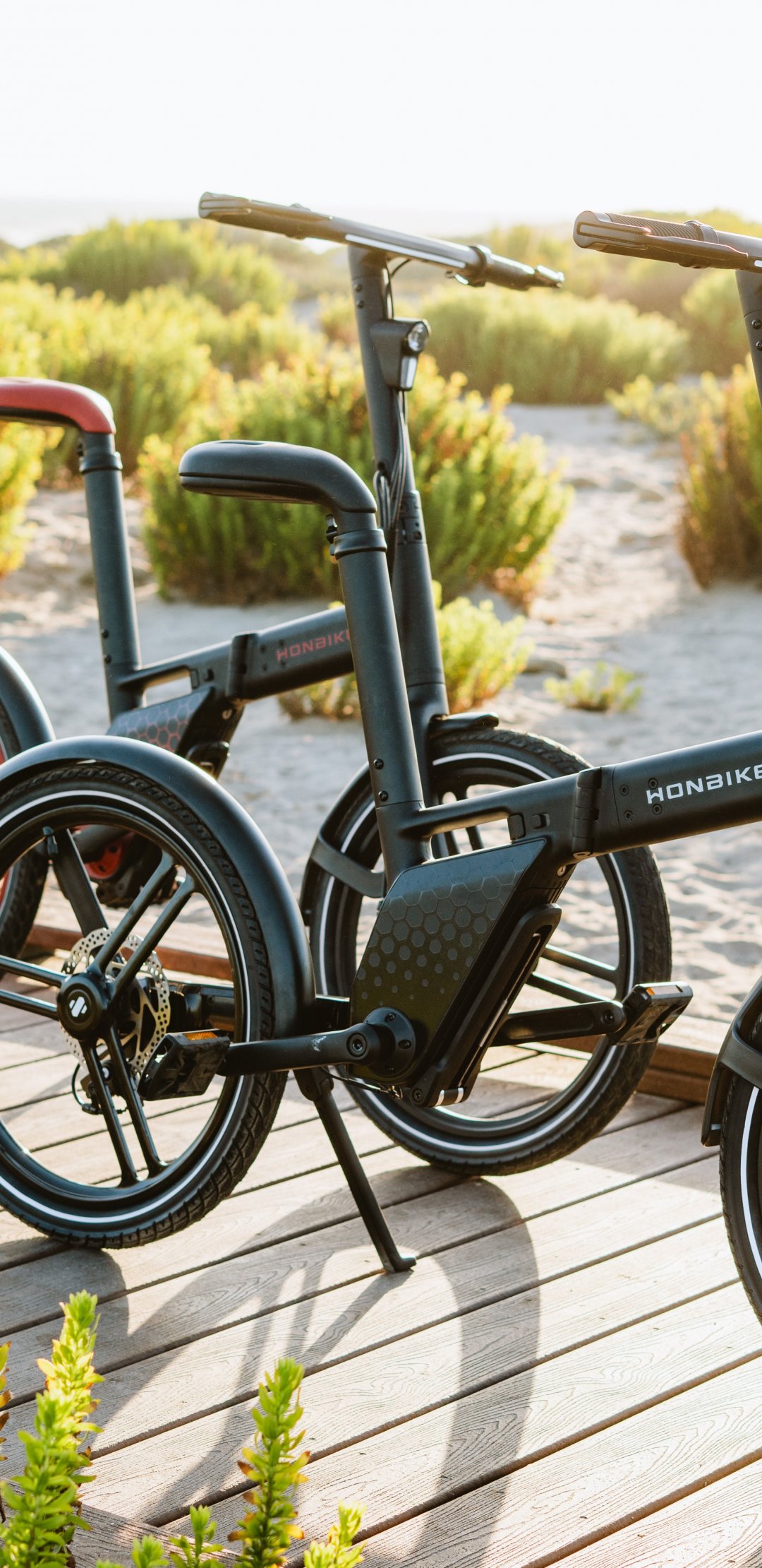 Wallpaper: two bikes, walkway on the beach - 1080x2220