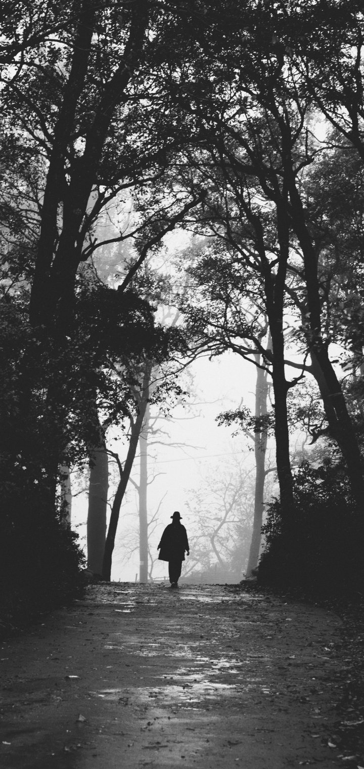 foggy forest, man, snow Wallpaper 720x1520