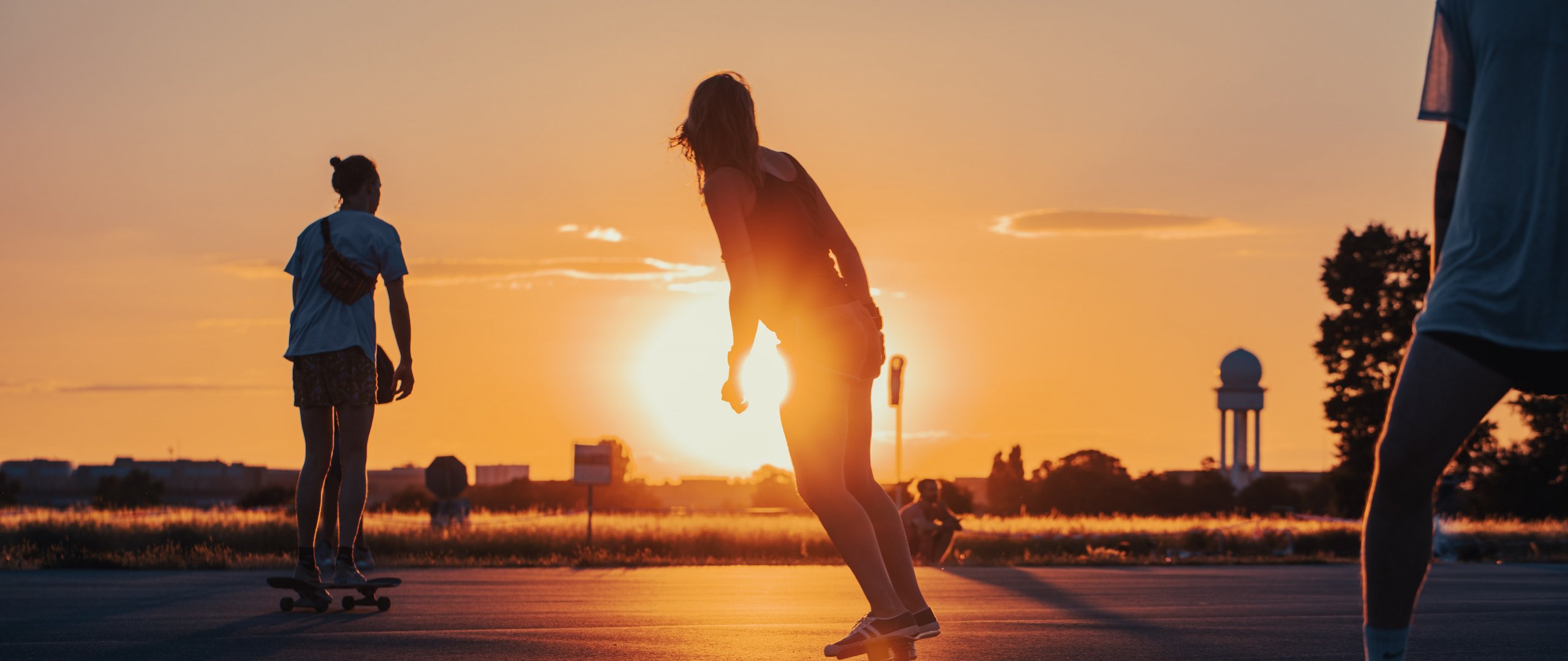 Wallpaper: skateboarders, sunset - 2560x1080