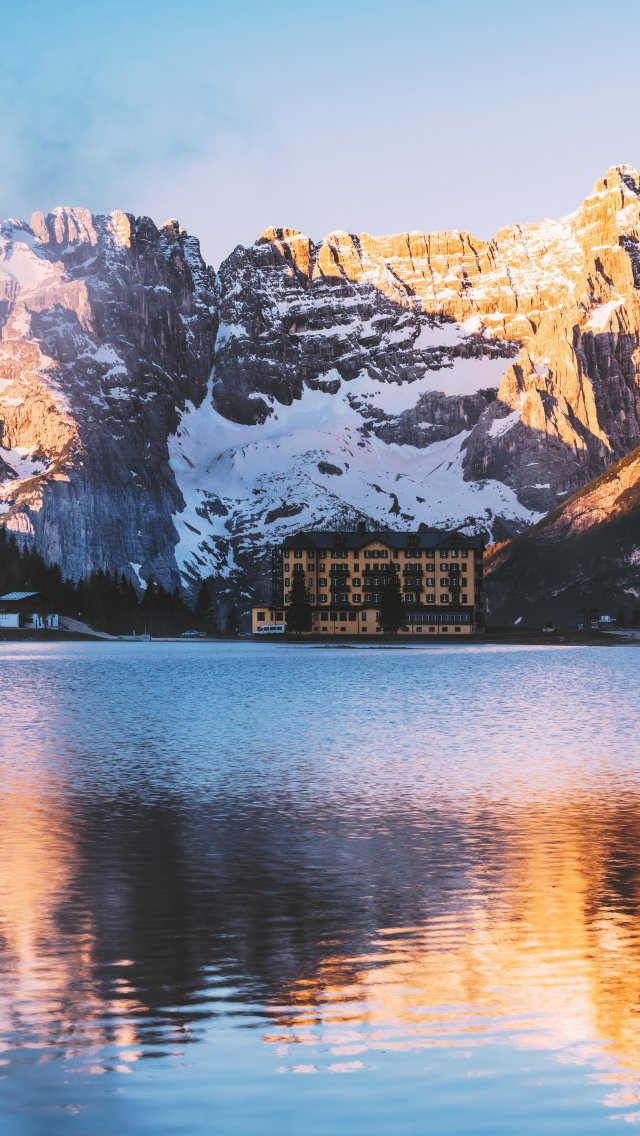 Wallpaper: lake house, mountain range - 640x1136