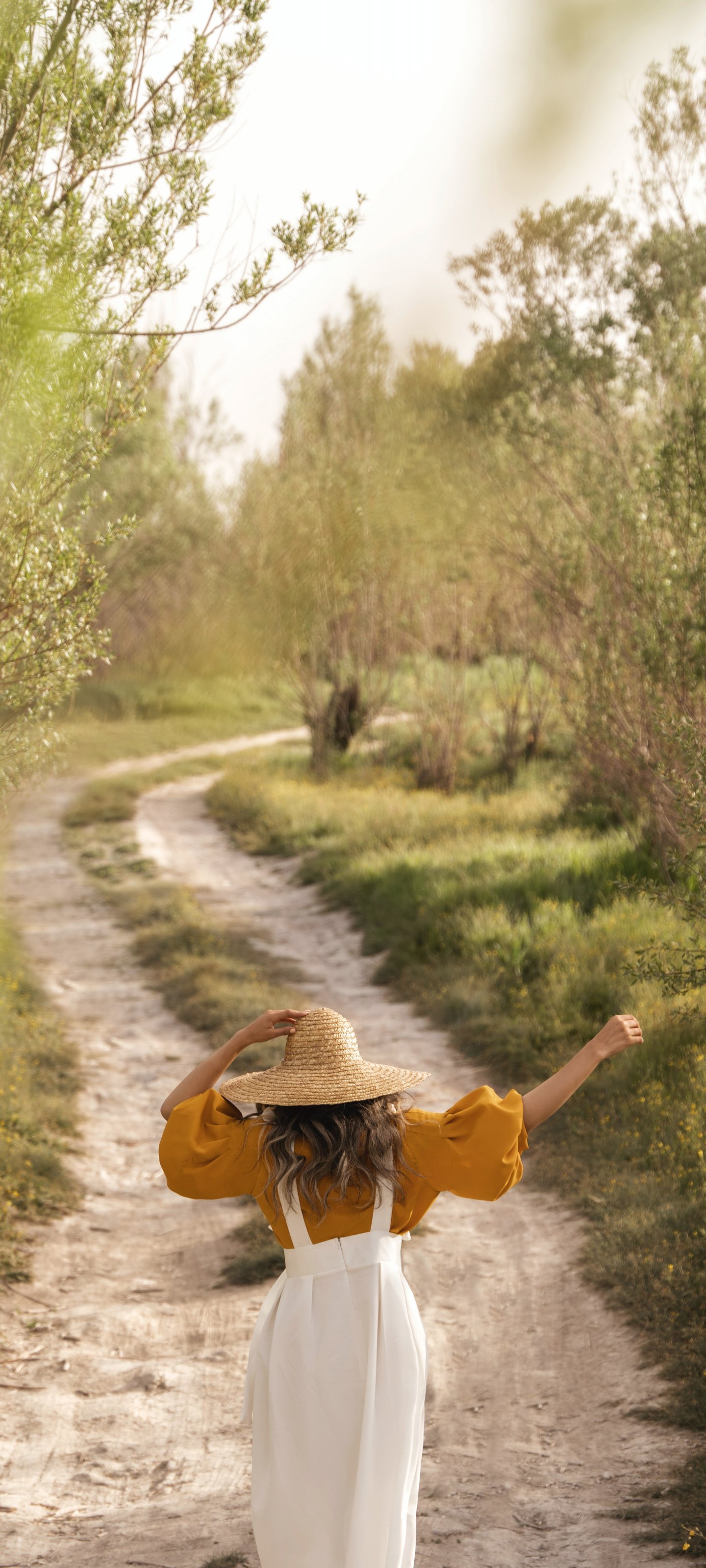 Wallpaper: footpath, girl in a hat - 1440x3200