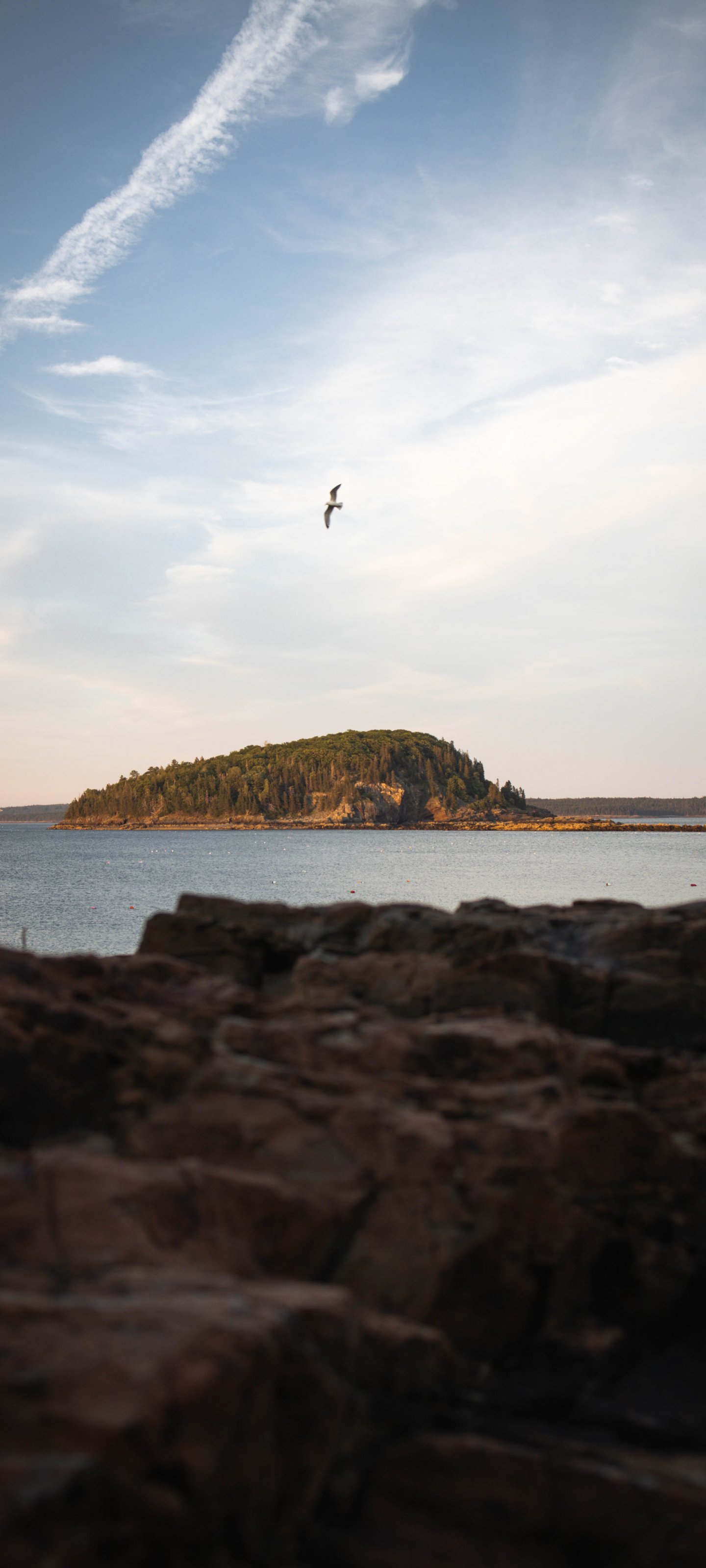 Wallpaper: island in the lake, bird flight - 1440x3200