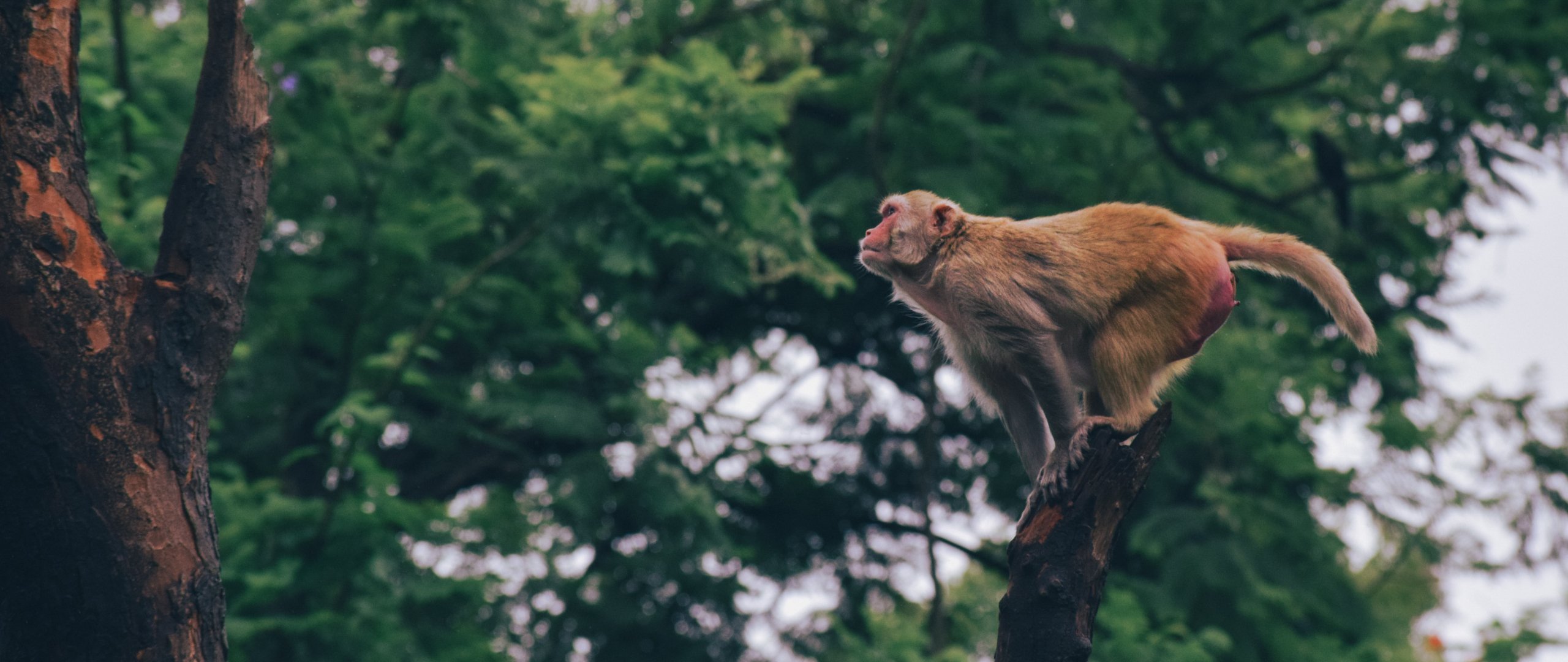 Wallpaper: red monkey, tree jump - 2560x1080
