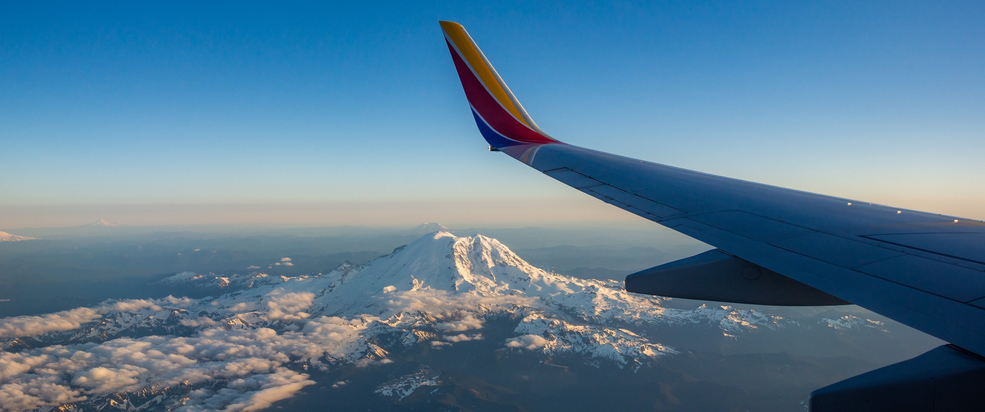 Wallpaper: airplane wing, flight, Mount Rainier - 3440x1440