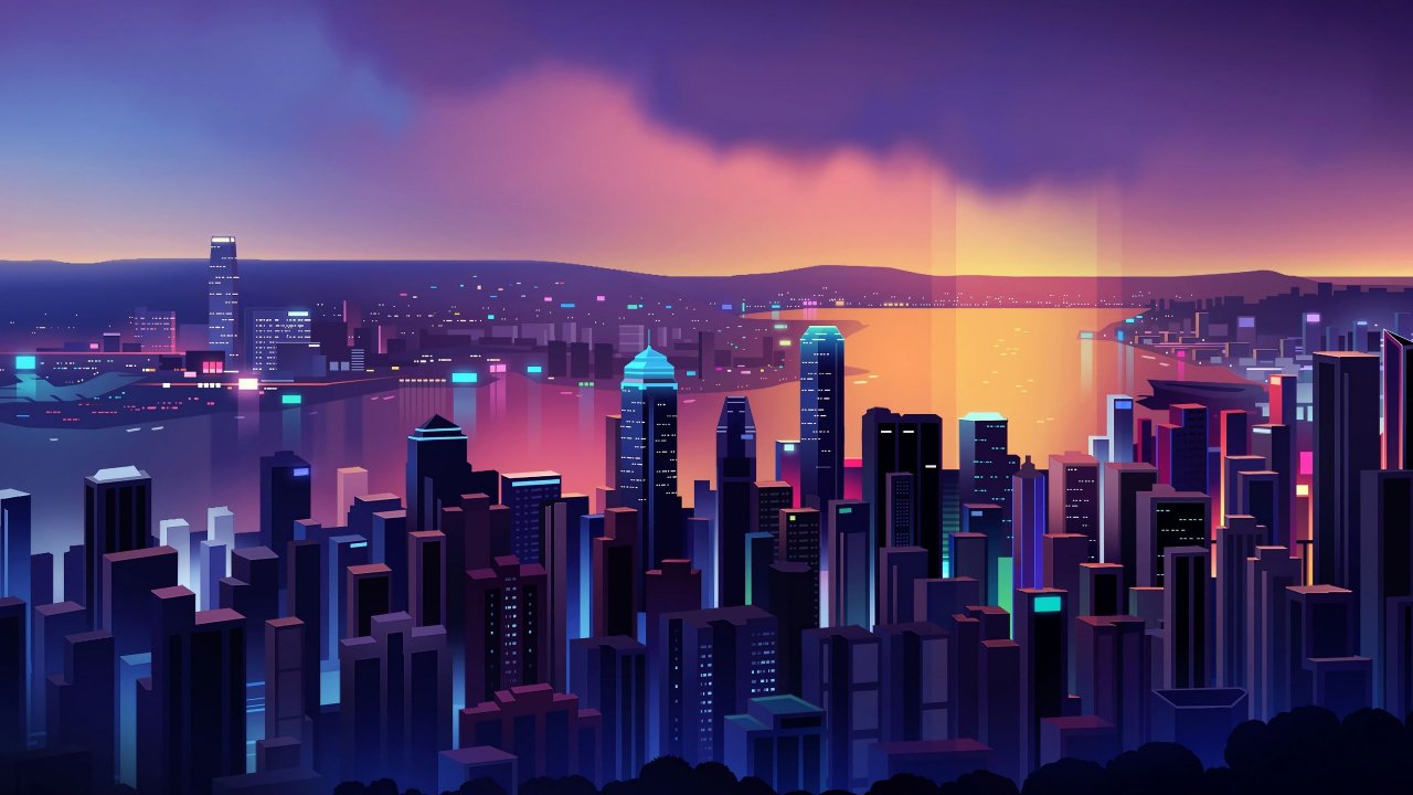 Wallpaper: night city, bird's-eye view, purple - 1280x720