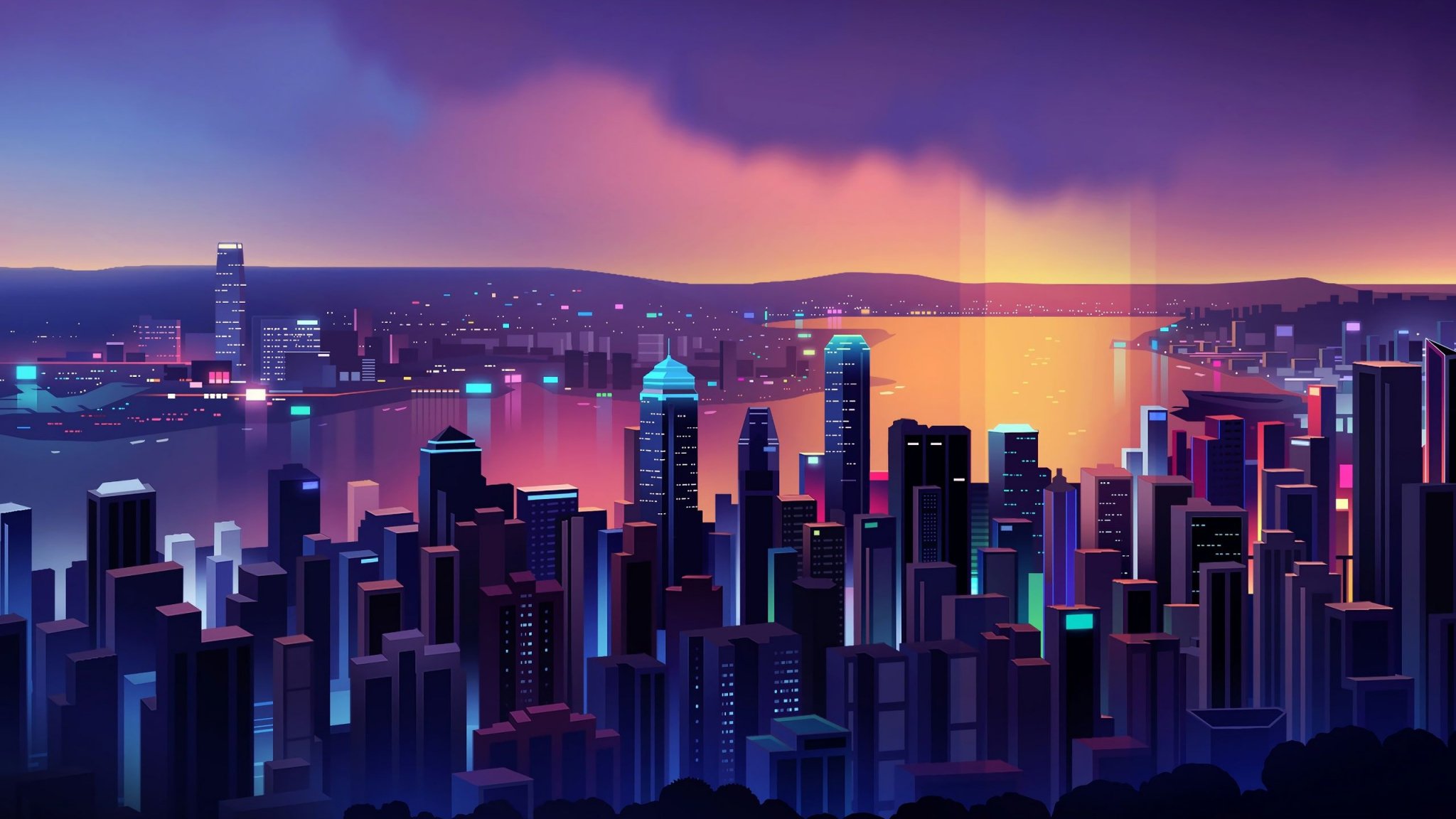 Wallpaper: night city, bird's-eye view, purple - 2048x1152