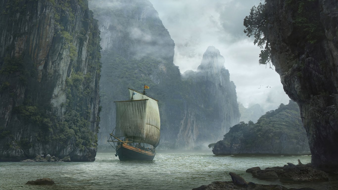 landscape, ship, mountain Wallpaper 1366x768